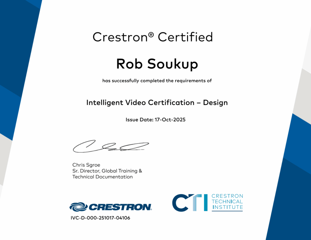 I recently completed the Crestron Intelligent Video Design (IVC-D) in-person certification course, gaining comprehensive knowledge in professional AV video system design and implementation. The IVC product line was originally 1 Beyond which Crestron acquired in 2022.