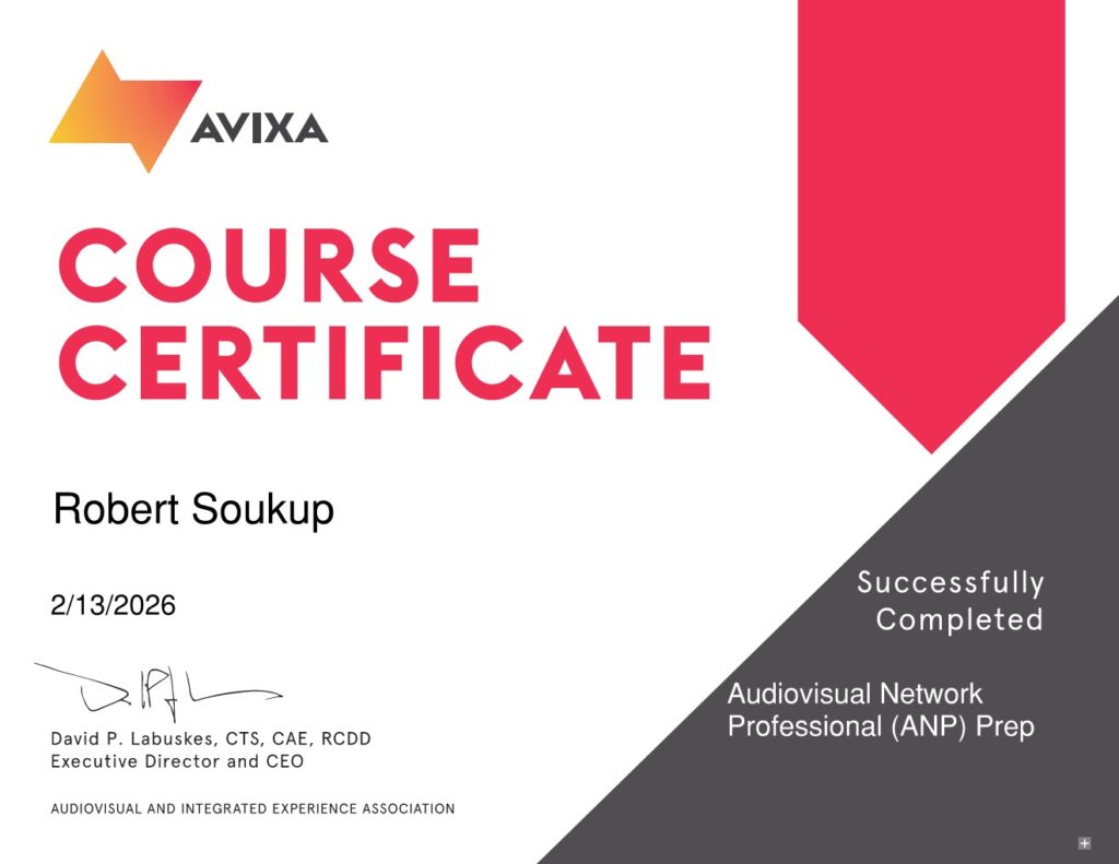 Completed the ANP Prep course which is designed to help you feel confident and well-prepared before sitting for the Audiovisual Network Professional (ANP) exam. This course focuses on reviewing the fundamental information about networking that might appear on the exam to help you focus your attention on areas that need it.